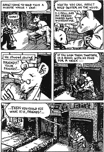 The prologue suggests the demark in which the Holocaust places Artie. In this flashback, equally a ten-yr-old boy, he turns to Vladek later two friends carelessness him when he falls while skating [Figure 1]. Little Artie is a boy in tears needing comfort from his father, but he gets none. Artie at first says zilch, which suggests that he is accustomed to repressing his feelings before Vladek. His father is absorbed in sawing a board and asks Artie for assist; just in the side by side console does he ask Artie why he is crying, which suggests that he is so self-absorbed that he doesn't take much notice of his son . So there is the simply facial closeup in the prologue: Vladek's head equally he says "Friends? Your friends?. . ." His dialogue continues in the last two panels, which are progressively longer shots, moving away from the scene: "If you lock them together in a room with no food for a calendar week. . . .Then you could run into what information technology is, friends!. . ." (Maus 5). Vladek means well: as a father, he is offer his son advice from his own life; just he is completely unaware that his extreme experiences in wartime Poland are inapplicable to the life of a ten-year-onetime boy living in New York City in 1958. Vladek still has a Holocaust mentality and lives in a globe where no one can exist trusted and even friends can turn into enemies. His nihilism hints at an abyss which at this point Artie knows nothing about and could not perhaps fathom. This is why the only facial closeup in the scene is of Vladek and why, in the last panel, Artie has shrunk to a tiny figure in the shadows while his father is highlighted in white. He has been bandage by Vladek into the shadow of the Holocaust. The prologue explains why Artie would go and then estranged, hiding his feelings from Vladek and not turning to him for paternal condolement or advice. The sufferings of Vladek are so catastrophic that they dwarf any pain that Artie could always feel, rendering his life and emotions insignificant and invalid (Bosmajian xi).